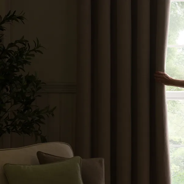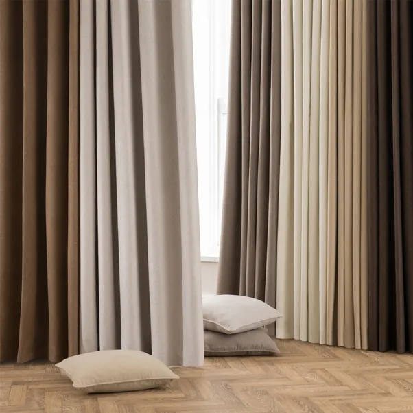 Luna Brushed Blackout Pencil Pleat Curtains feature a soft brushed fabric with blackout lining, offering excellent light control, privacy, and a refined look for modern interiors.